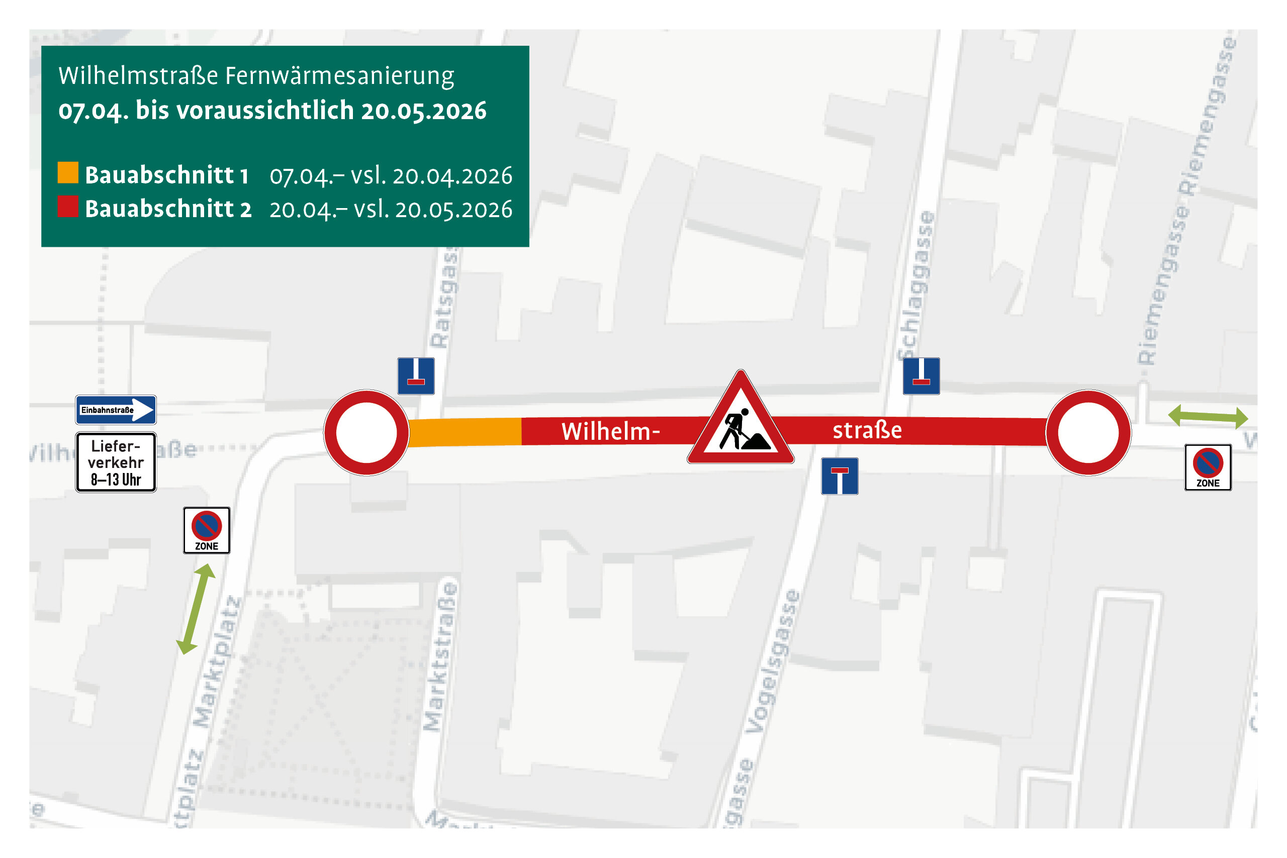 Im ersten Bauabschnitt, der vom 7. April bis voraussichtlich 20. April andauert, wird die Ratsgasse selbst sowie die Wilhelmstraße im Bereich zwischen Ratsgasse und Schlaggasse voll gesperrt. Zugleich werden die Schlaggasse als auch die Vogelsgasse zu Sackgassen, da die Zufahrt auf bzw. die Einfahrt von der Wilhelmstraße nicht mehr möglich ist. Über die Windische Gasse bleibt eine Zufahrtsmöglichkeit zum Marktplatz über die Vogelsgasse bestehen.